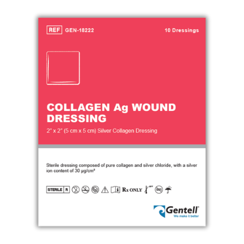 Gentell Collagen Ag (Silver) Wound Dressings are comprised of bovine collagen and silver chloride intended for the management of wounds as well as helping prevent bacterial colonization within the dressing. Gentell Collagen Ag (Silver) Wound Dressings are sterile, single-use, pliable, absorbent and biodegradable wound dressings. In the presence of the wound exudate, these dressings transform into soft, conformable gel sheets that maintain a physically moist environment to protect the wound and support natural healing.