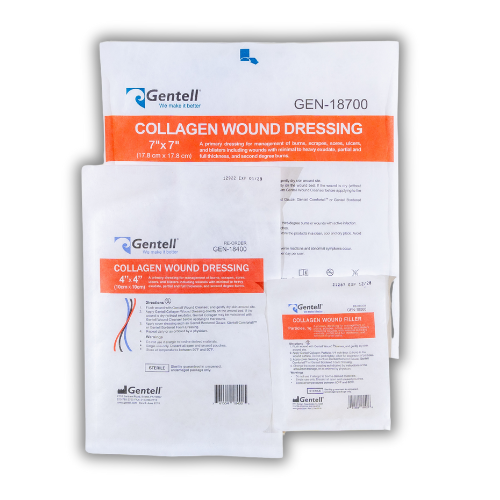 Gentell Collagen is a primary dressing for management of burns, sores, blisters, scrapes, and ulcers.