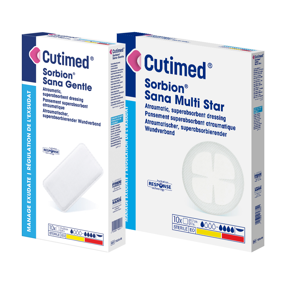 Cutimed® Sorbion® Border is a bordered, sterile, hydroactive, gel-forming, self-adhesive, superabsorbent wound dressing, offering atraumatic dressing changes. The dressing consists of a strong water-retaining superabsorbent core, a wound contact layer from a hypoallergenic polypropylene, a silicone adhesive border and a breathable, waterproof backing from polyurethane which allows the ability to shower.