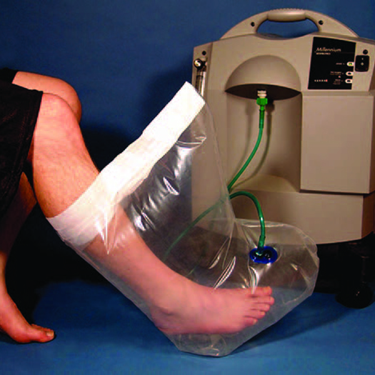 Transcutaneous oxygen therapy is a noninvasive topical method of providing oxygen to the wound bed to facilitate healing. Devices and dressings that provide concentrated oxygen may contribute to a more conductive local wound healing environment.