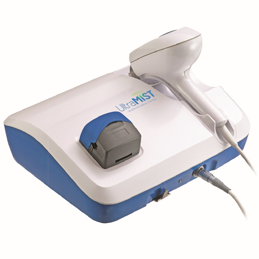 The UltraMIST® system delivers low frequency ultrasound to the treatment site using a non-contact fluid (e.g., saline). It produces a low energy ultrasound-generated mist used to promote wound healing.