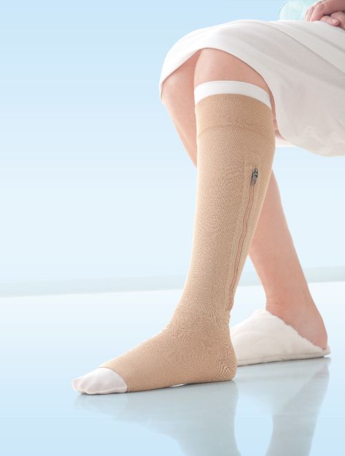 Compression stockings are elastic hosiery garments applied to a lower limb to achieve graduated compression. They are used for management of conditions such as venous hypertension, lymphedema, and venous ulcers to reduce edema and aid the return of venous blood to the heart. The physician order should include specification of level of compression and anatomic area(s) to be treated. Always apply according to the manufacturer’s recommendations.