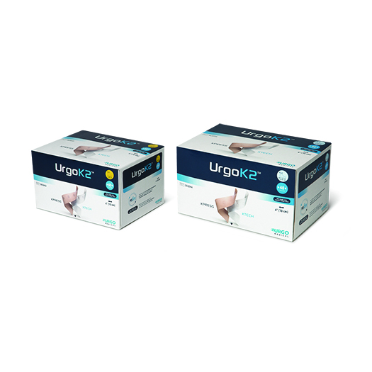 UrgoK2™ is a dual compression system composed of a short stretch bandage (KTECH) and a long stretch bandage (KPRESS). Exclusive PresSure system with pressure spot indicators on both bandages aids the application of the recommended therapeutic pressure of around 40mmHg from the first application.
