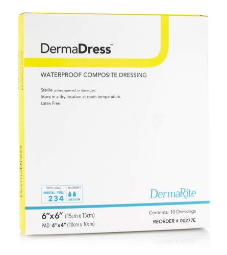 Composite dressings are indicated for use as either a primary or secondary dressing in the treatment of minimally to heavily draining partial- and full-thickness wounds such as stage I-IV pressure ulcers, dermal ulcers, and surgical incisions.