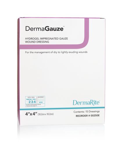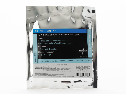 Impregnated hydrogel wound dressings are gauzes and nonwoven sponges, ropes, and strips saturated with an amorphous hydrogel. Amorphous hydrogels are formulations of water, polymers, and other ingredients with no shape, designed to donate moisture to a dry wound and to maintain a moist healing environment. The high moisture content serves to rehydrate wound tissue. These may be used in partial- and full-thickness wounds, wounds with necrosis, and deep wounds with tunneling or sinus tracts. Impregnated hydrogels are available in a wide variety of sizes.