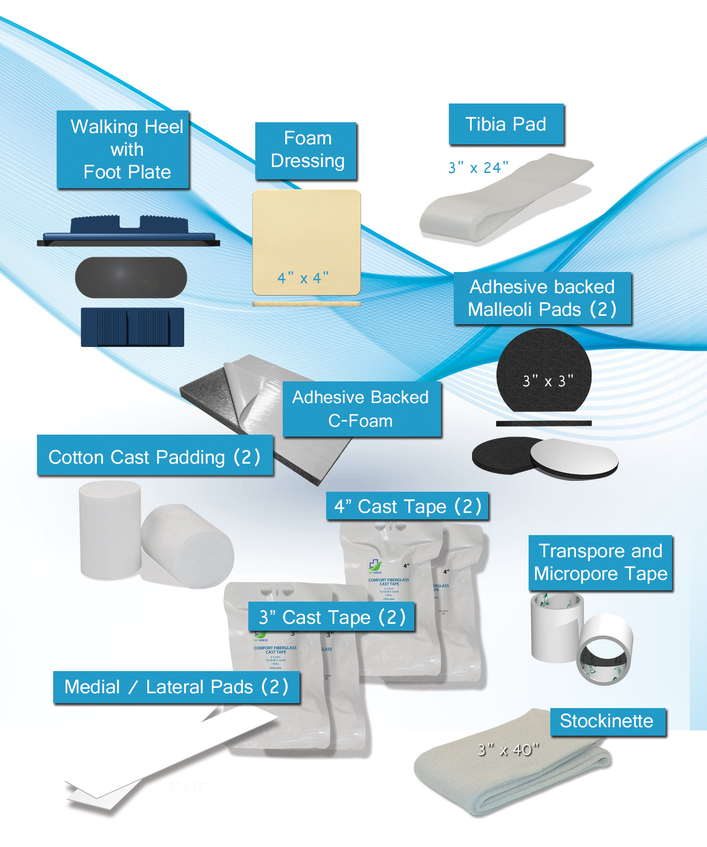 Total contact cast systems are indicated for use on diabetic foot conditions, such as non-infected neuropathic ulcers, as well as pre-ulcerative conditions and post-operative wounds.