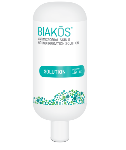 BIAKŌS™ Antimicrobial Skin & Wound Irrigation Solution is intended for the mechanical irrigation and removal of debris, dirt and foreign materials, including microorganisms, from skin and wounds, including stage 1-4 pressure injuries, diabetic foot ulcers, post-surgical wounds, first- and second-degree burns, and grafted and donor sites.