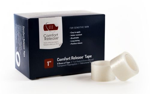 Comfort Release® Tape is for sensitive skin and is easy to apply, water resistant, breathable, and long lasting with painless release. Made with a transparent, bidirectional tear polypropylene film, and adhesive; not made with natural rubber latex.