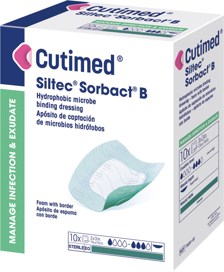 Cutimed® Siltec® Sorbact® B is intended for use in the management of clean, contaminated, colonized or infected low to high exudating wounds, such as surgical wounds, traumatic wounds, pressure injuries, diabetic foot ulcers and venous leg ulcers. It is intended to be used on superficial wounds.
