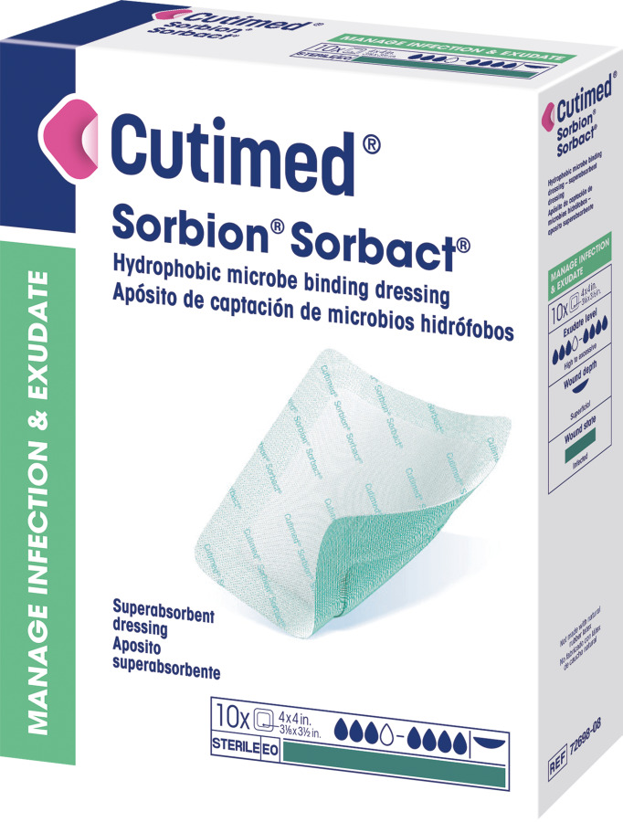 Cutimed® Sorbion® Sorbact® is a hydrophobic bacteria binding superabsorbent dressing. The super absorbent core absorbs and retains moderate to high levels of exudate, reducing the risk of potential skin maceration, even under compression. The wound contact layer is coated with Sorbact® Technology to safely and effectively bind hydrophobic bacteria without releasing active substances into the wound.