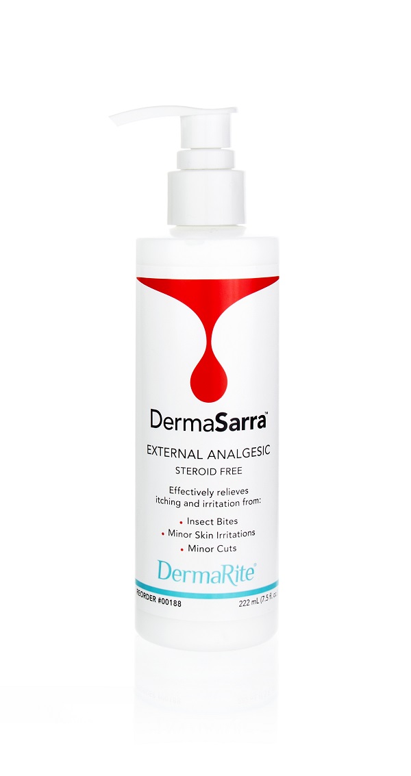 DermaSarra™ External Analgesic provides temporary relief from itching associated with minor skin irritations such as dry skin, poison ivy, oak, sumac, insect bites, detergents, and sunburn. Steroid-free. Contains menthol and camphor.