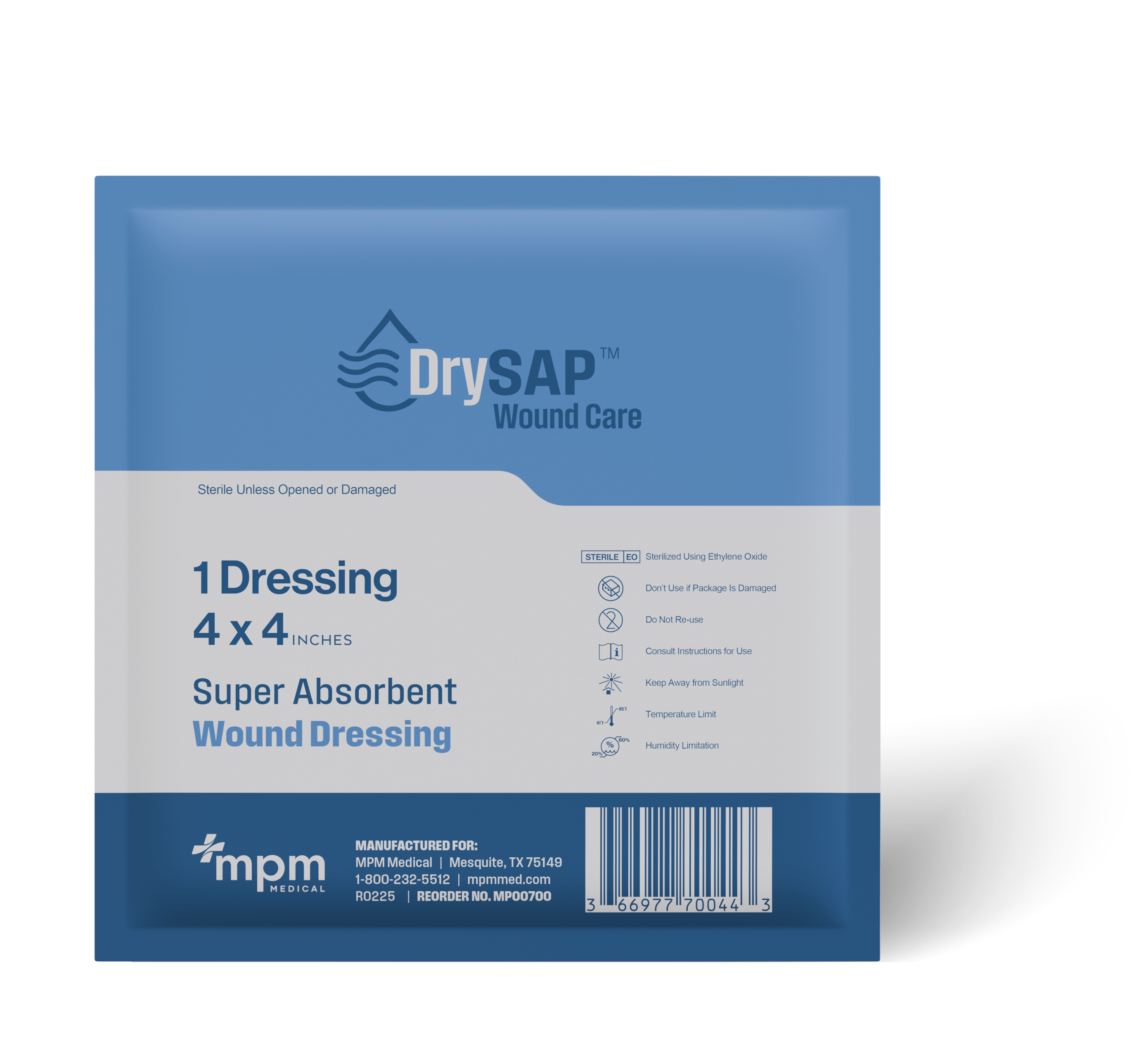 DrySAP™ Super Absorbent Polymer (SAP) Dressing is an ultra-absorbent dressing that effectively traps wound exudate, bacteria, and harmful substances, promoting healing for difficult-to-reach or heavily draining wounds.