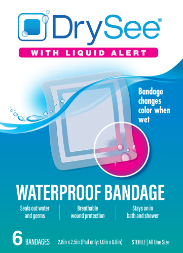 DrySee® Bandage is a waterproof dressing with a wetness indicator. A perimeter ring intercepts and traps moisture upon intrusion from the outside. Center pad changes color with saturation.