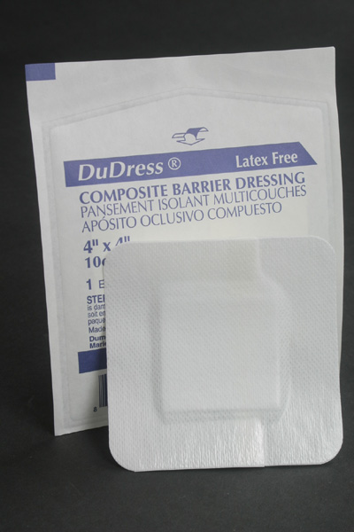 DuDress® is an all-in-one composite dressing. Non-adherent absorbent center pad, adhesive border, soft gauze and film top for barrier protection.