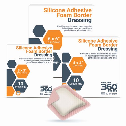 GEMCORE360°™ Silicone Adhesive Foam Border Dressings are sterile foam dressings made with a highly absorbent, conformable foam pad, protective film backing, gentle silicone adhesive and secure border.