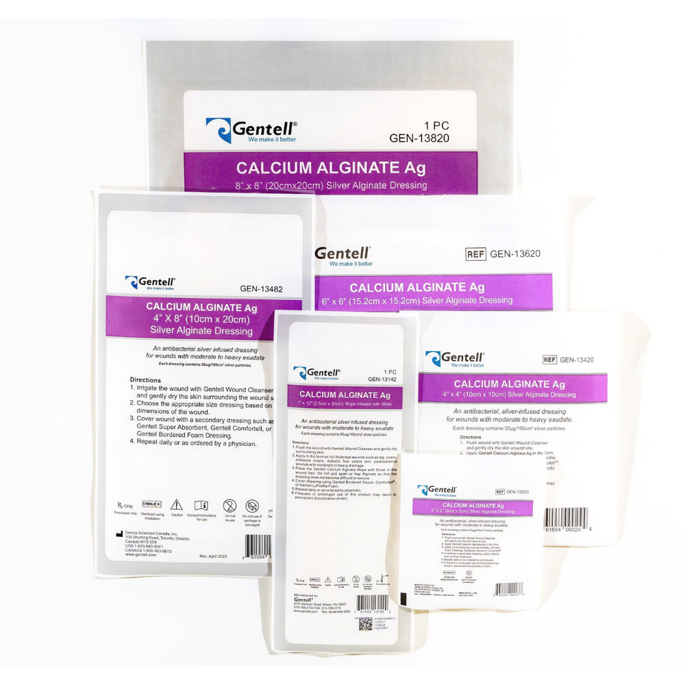 Gentell Calcium Alginate Ag (Silver) Dressings are a sterile, antimicrobial fiber-structured alginate with high absorbency. Fights bacteria and a broad spectrum of microorganisms while absorbing and containing exudate in a moist healing environment.