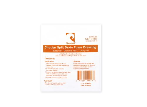 Gentell Circular Split Drain Foam Dressing is a sterile, waterproof, absorbent foam with an island design. Provides the wound with protection from external threats and its porous texture is highly absorbent.