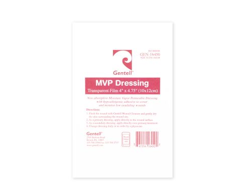 Gentell MVP Transparent Film Dressing is a moisture vapor permeable transparent membrane coated with a layer of acrylic hypoallergenic adhesive that can be used to cover low exudating wounds.