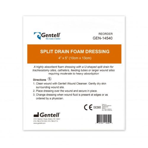 Gentell Split Drain Foam Dressing may be cut and applied to pressure injuries, chronic and acute wounds, and full-thickness wounds.