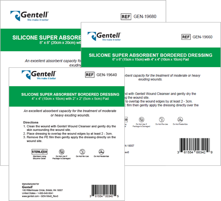 Gentell Super Absorbent Silicone Bordered Dressing's multi-layer construction has excellent absorbent capacity for treatment of moderate or heavy exuding wounds. Comfortable, breathable, and waterproof non-woven backing with silicone border provides gentle adherence for fragile skin.