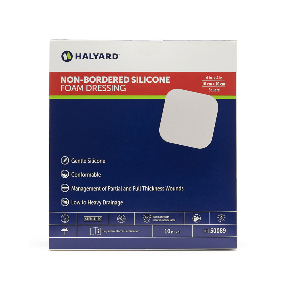 HALYARD* Non-Bordered Foam dressing is made with an absorbent foam layer, protective film backing, and gentle silicone adhesive.