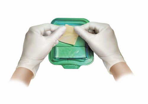 Rinse the product with a sterile saline solution in the inner tray for at least two minutes. Keep product in the tray until application. When ready to apply the product, remove the product from the tray and peel off the protective plastic sheets.