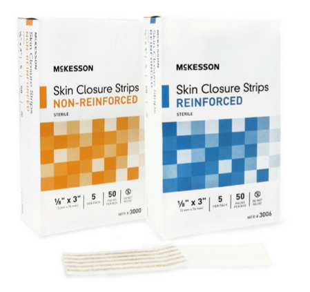 McKesson Skin Closure Strips are designed to provide superior wound closure and security. They are made of a macro-porous, non-woven polyamide material with pressure-sensitive adhesive. Available in non-reinforced and reinforced formulations.