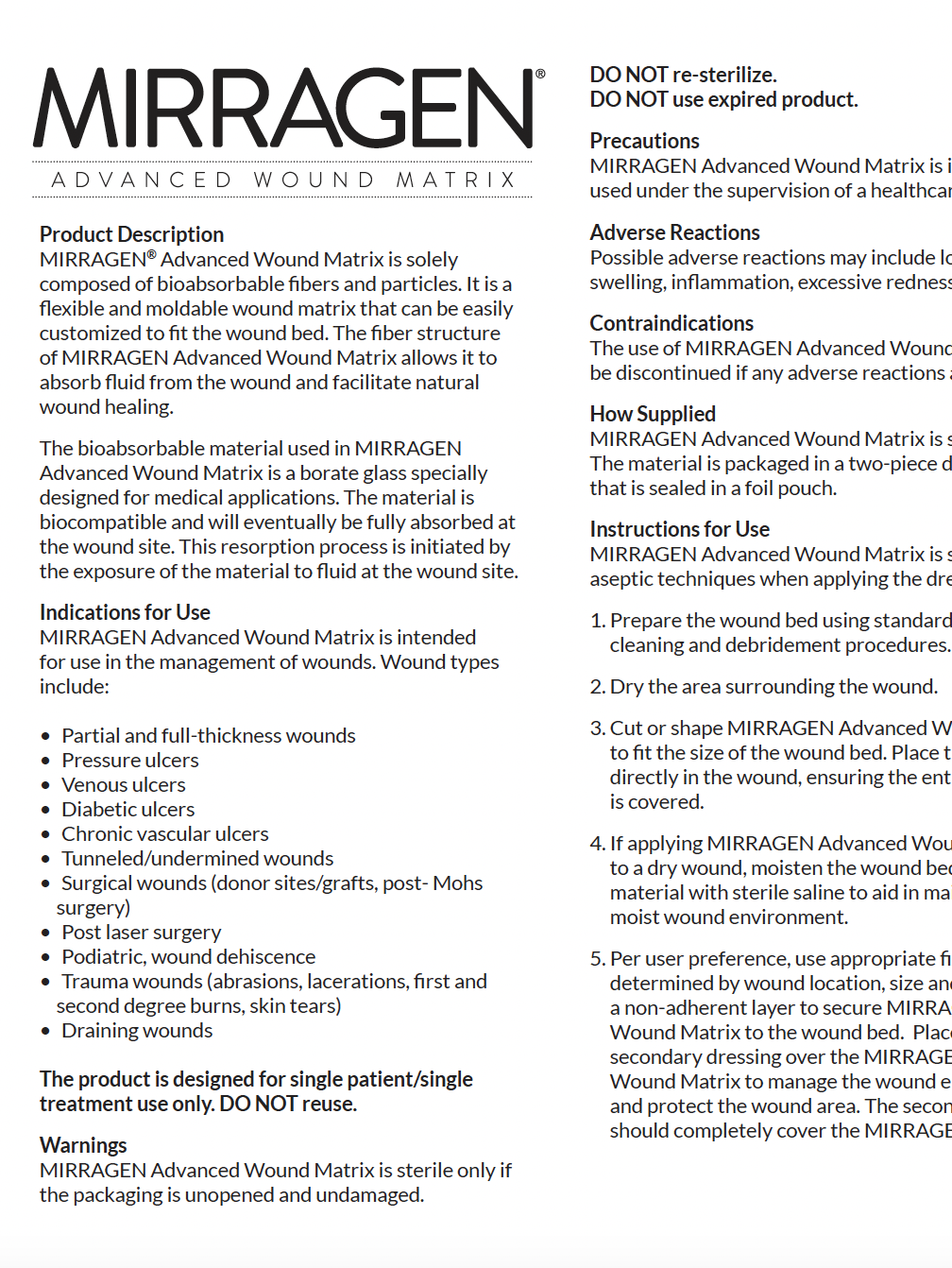 Mirragen® Advanced Wound Matrix is sterile only if the packaging is unopened and undamaged. Do not re-sterilize. Do not use expired product. Mirragen® Advanced Wound Matrix is intended to be used under the supervision of a health care professional.