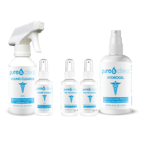 Pure & Clean is a 0.02% hypochlorous acid solution wound cleanser.