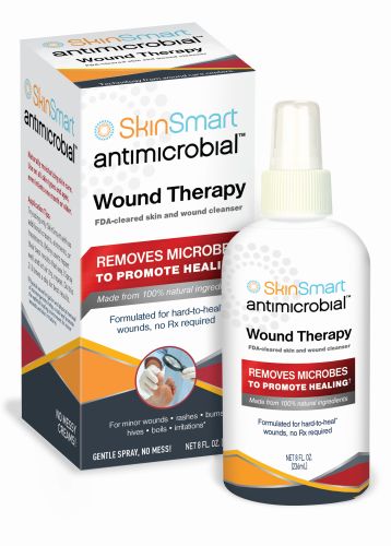 SkinSmart™ Antimicrobial Wound Therapy targets bacteria in chronic wounds. Safely removes bacteria without irritating skin or the open wound. FDA cleared for all skin including eyelids, mouth, scalp or groin. Safe for daily use.