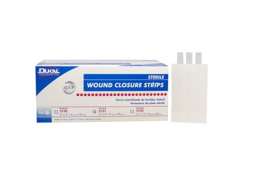 Sterile Wound Closure Strips are adhesive backed, thin, non-woven, reinforced fibers arranged in a bilateral pattern for high tensile strength.