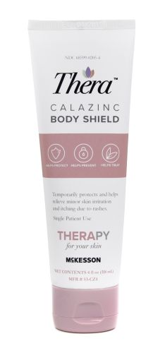 Thera® Calazinc Body Shield helps prevent skin irritation associated with wet, cracked skin as well as chafing and incontinence-associated dermatitis. Featuring the added protection of calamine, this shield forms a long-lasting barrier between denuded or exposed skin and moisture.