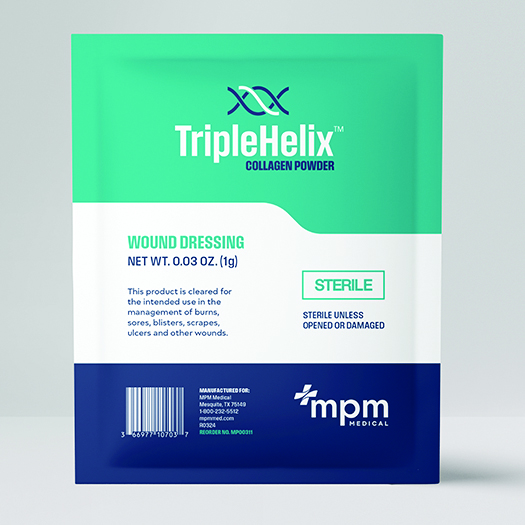 TripleHelix Wound Care Collagen is an American-made collagen available in powders, pads, and ropes. It contains no additives and is made of 100% Type 1 bovine collagen.