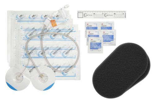 2 foam dressings (17cmx15cmx1.8cm), 2 sheets of V.A.C.® Advanced Drapes, 1 foam quantity label, 2 packets of Cavilon™ No Sting Barrier Film, 1 VeraT.R.A.C.™ Pad and Tubing Set, 1 disposable ruler (case of 5).