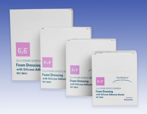 ZeniFOAM GENTLE BORDER is a sterile, multi-layered, silicone-faced, polyurethane foam dressing with a silicone border designed to absorb moderate to heavy drainage. Protects fragile skin and reduces painful dressing changes.