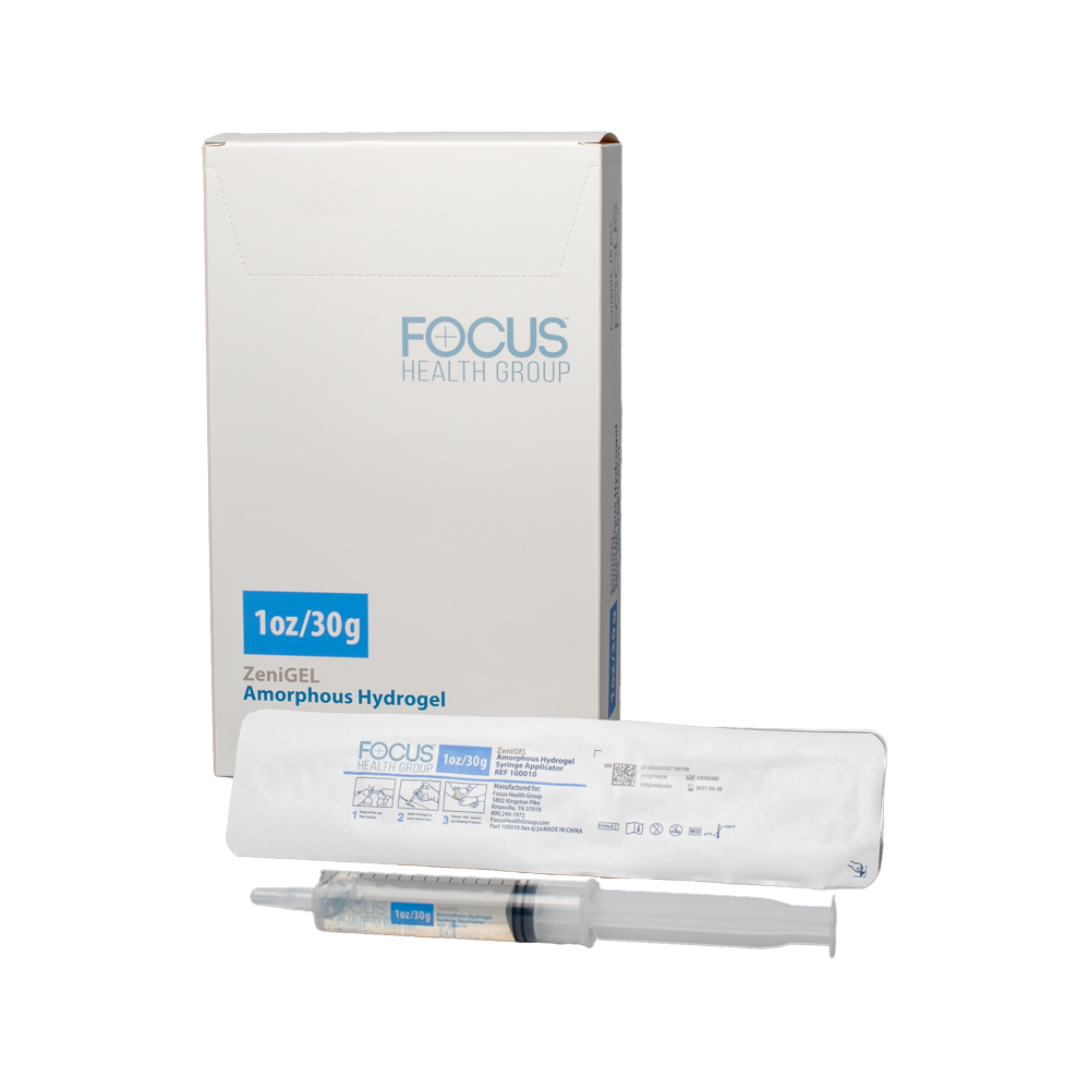 ZeniGEL Amorphous Hydrogel dressing is available in a syringe applicator. ZeniGEL contains a transparent soothing gel designed to gently rehydrate necrotic tissue, promote a moist healing environment, facilitate autolytic debridement, and absorb excess wound drainage. The applicator is easy to use and allows the gel to be delivered directly onto the surface of shallow wounds or in deep, tunneling wounds.
